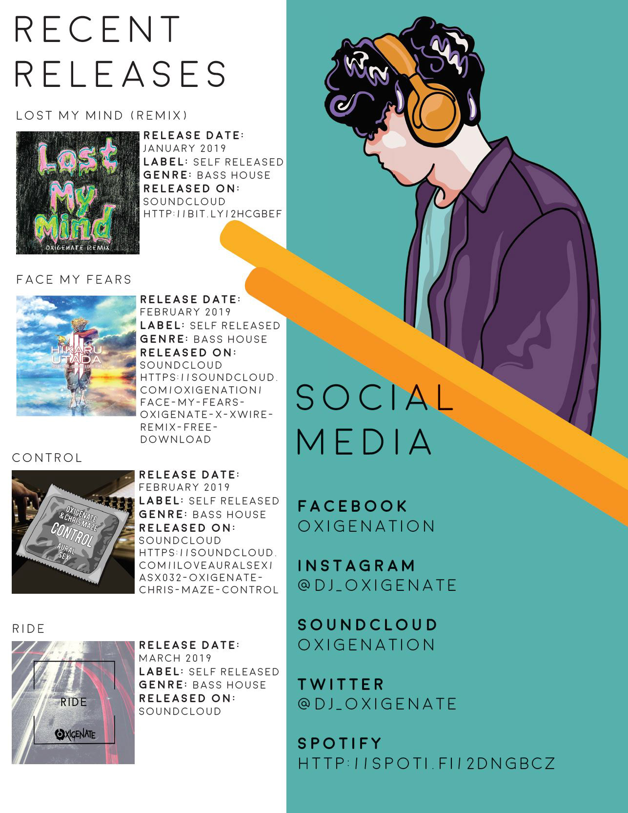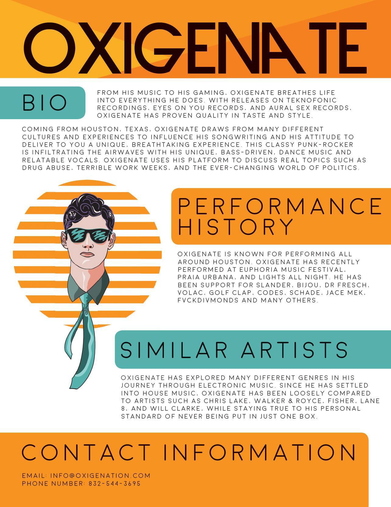 I was commissioned to design t-shirts and an electronic press kit (EPK) for DJ Oxigenate. I conceptualized the shirts, finalized the colors, designed two portraits of him and the graphics, and prototyped them according to his brand and target audience. His EPK required interactivity and to be true to his following, so I incorporated the same principles from his shirts into his EPK.