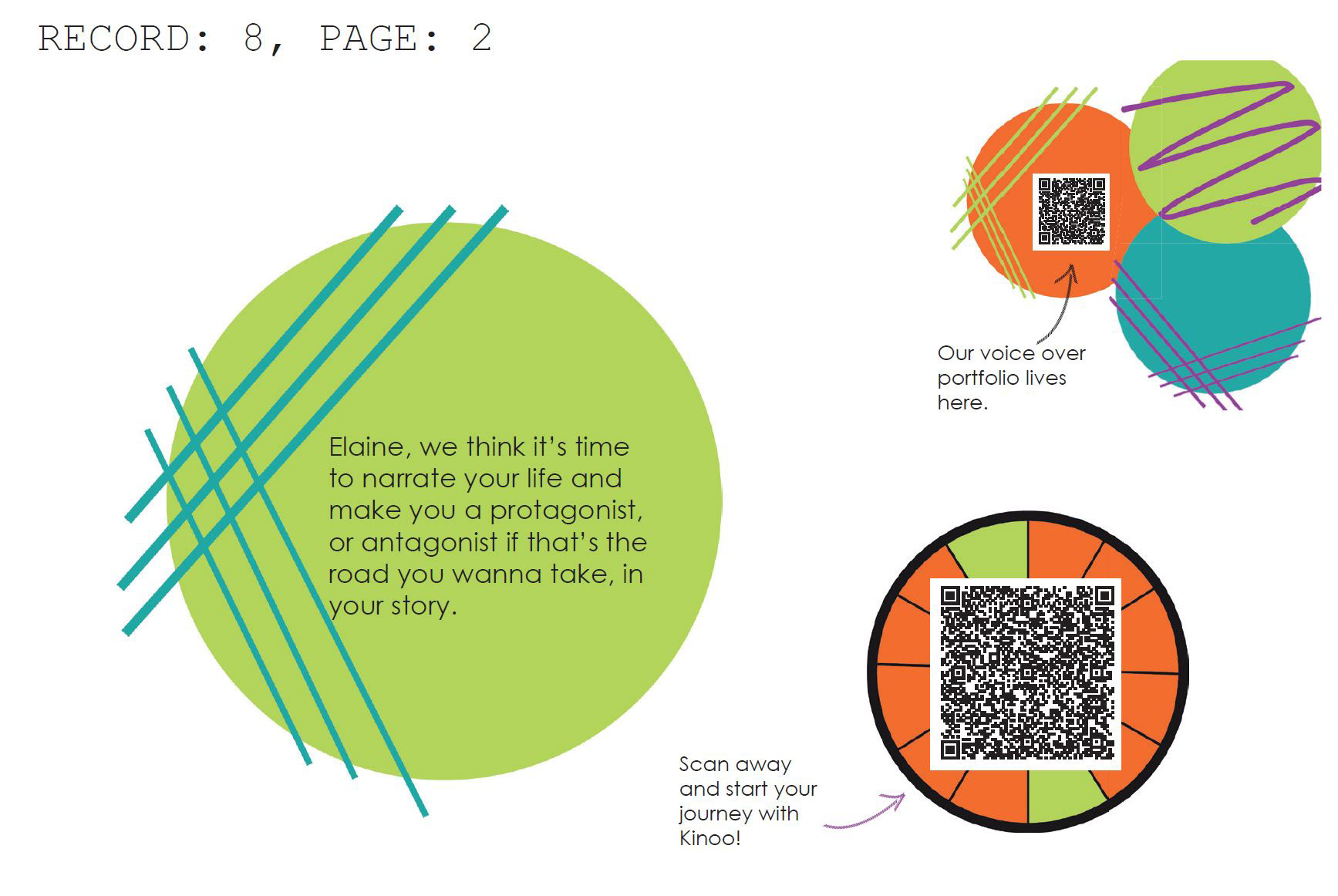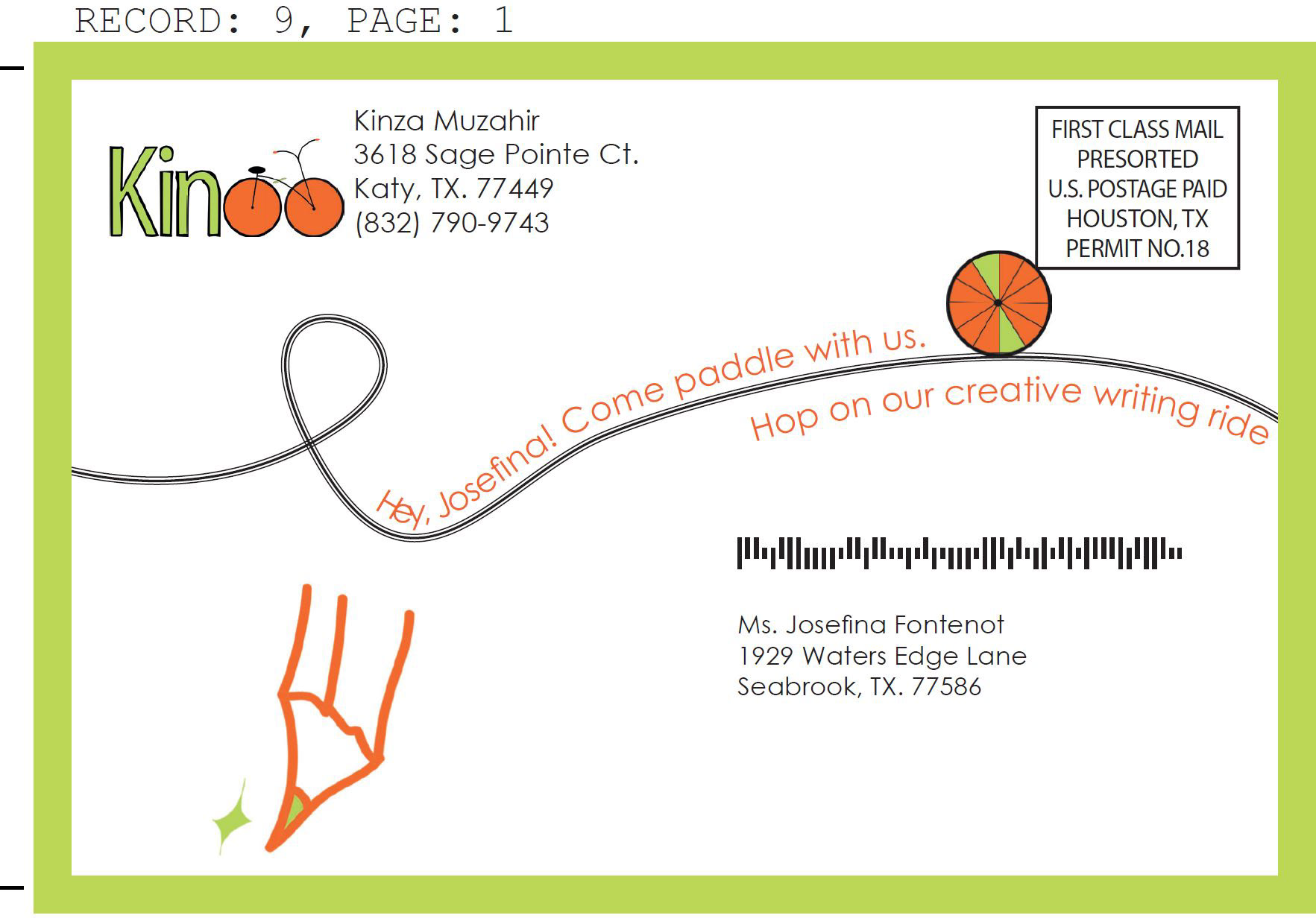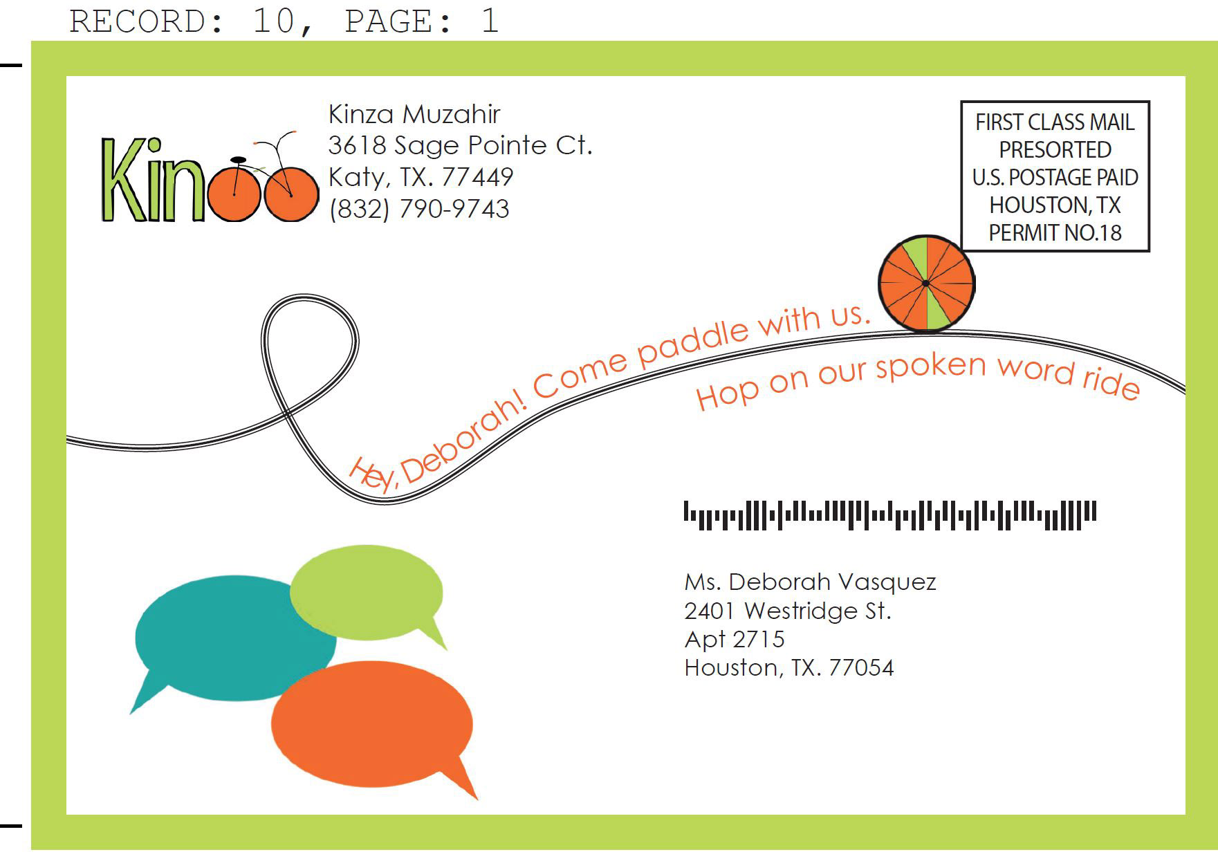 This Postcard was designed as an advertisement for the brand, Kinoo. I used the software XMPie to utilize its variable data attributes. I Linked XMPie uCreate to an MS-Excel file and, within inDesign, added the design variables and custom rules for certain pictures and styles to be subject to the person the postcard is being delivered to. Variable data here includes text, QR-codes, USPS intelligent mail bar codes, photos, and custom style options. Additionally, XMPie was used to impose this document when turning it into a PDF. I used the cut and stack option to highlight exactly how it should look once printed.