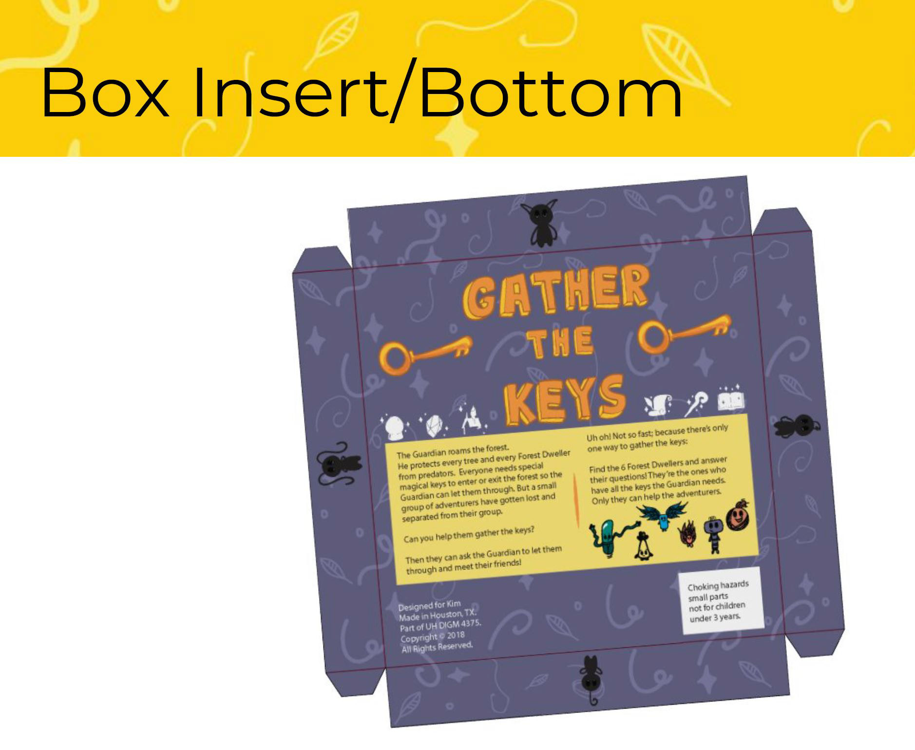 Gather the Keys is an educational board/card game for elementary school kids which was designed for a client. This was a collaborative effort by myself and my partner, Solida Chem. The client requested a theme and brand for a game structure she invented for her kids, something she now wanted to market. Solida and I banked on some field research and decided the game should be amplified using an adventure-themed story. We created the brand, concept, story, characters, and artwork to present the client with the following package designs. Software used: Adobe Illustrator and Esko.