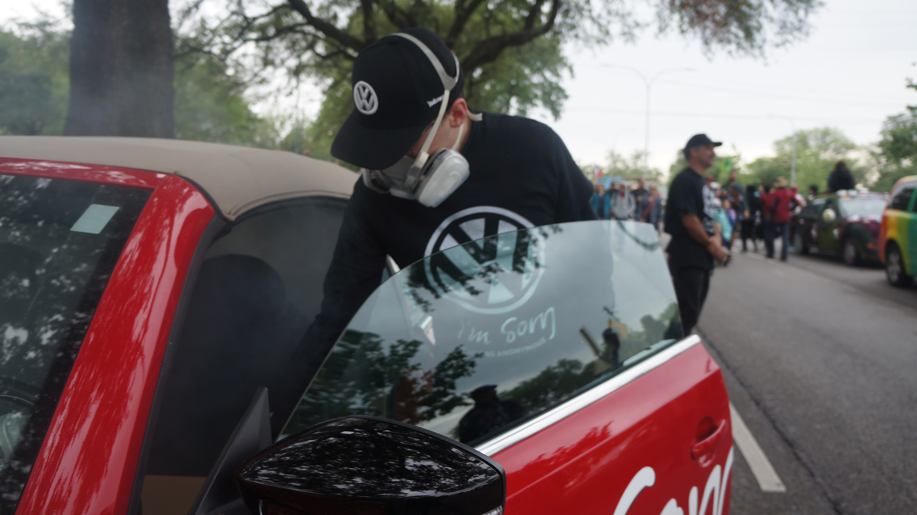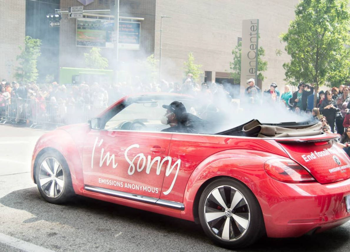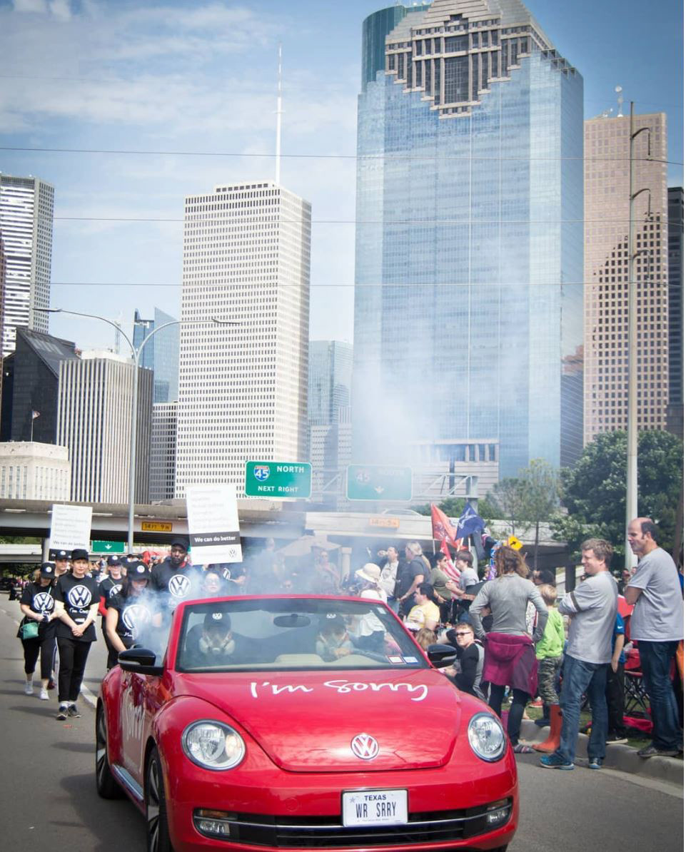 Our team consisted of volunteers from around UH and greater Houston who decided to take on Volkswagen for lying about their emissions tests. The Yes Men are known for impersonations and so the obvious idea was to walk as Volkswagen representatives through the Houston Art Car Parade and apologize to the public for harming them with fumes emitted from their cars.