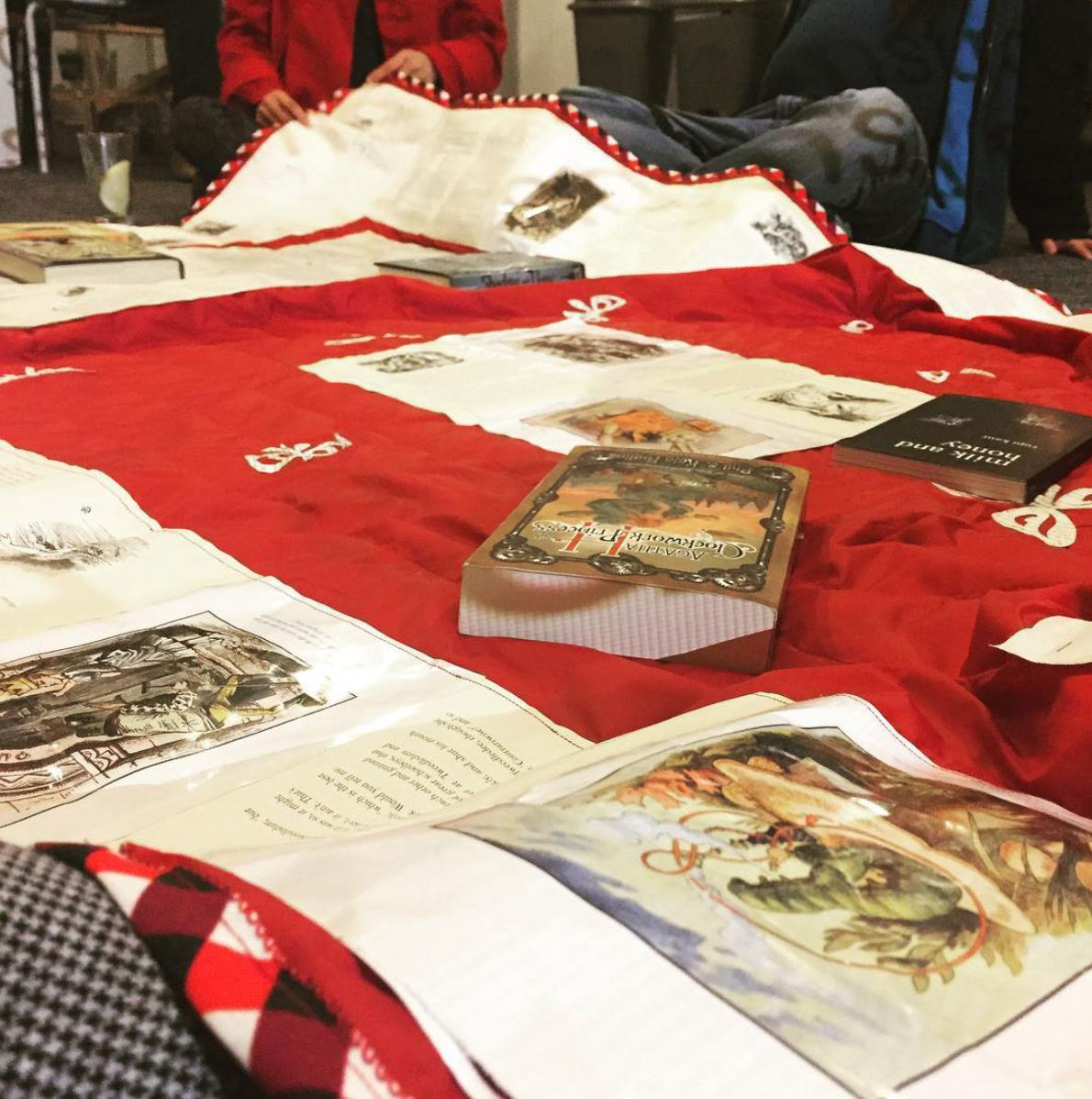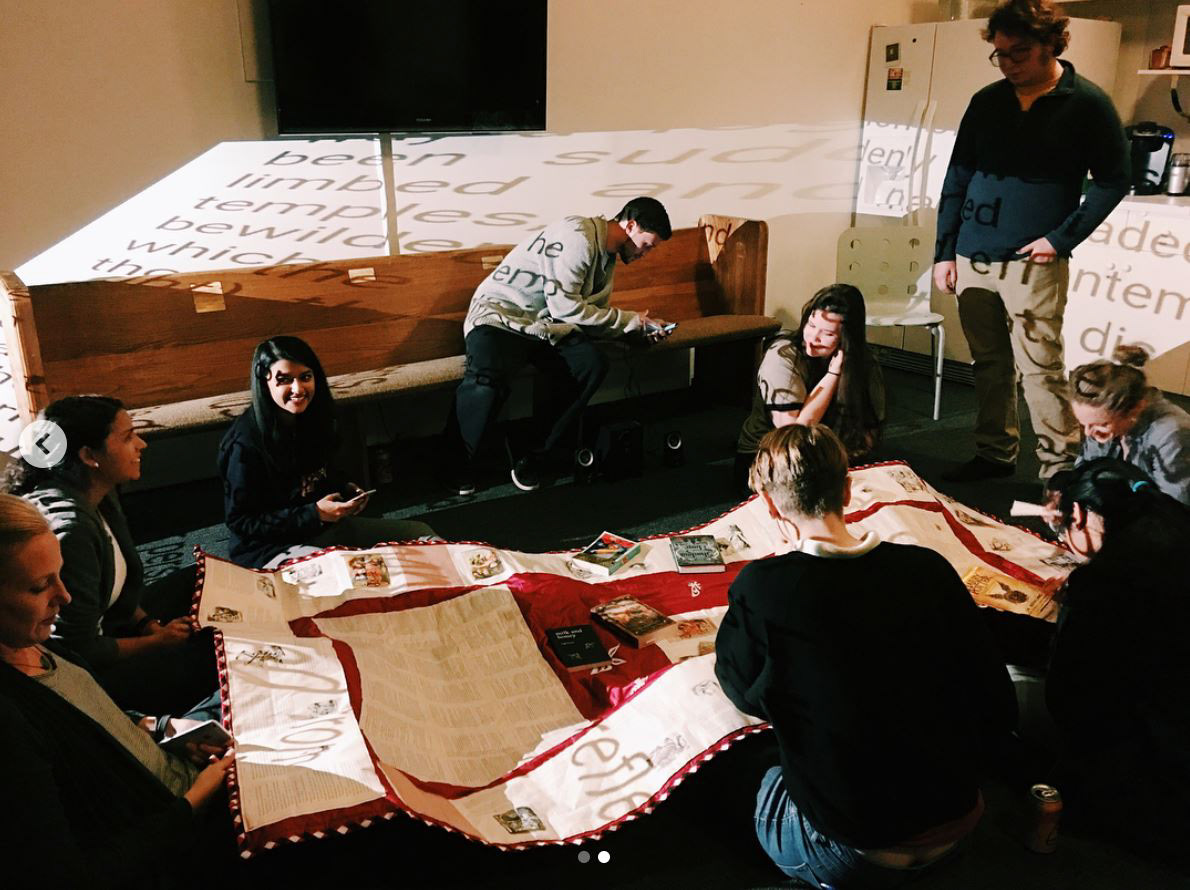 Stitch encompassed everything idyllic about curling up with an interesting book in a comfortable nook. The star of the show was the "literary comforter" which was hand stitched to submerge the project in a sense of community that comes with sharing stories. It was stitched to pages from books (sourced from an independent used bookstore which would otherwise recycle them) that the participants felt a strong bond to. Attendees were encouraged to bring their own books to the meet to share as everyone sat under the comforter, a projector showed it's own stream of stories to music, and exchanged dialogue on books, authors, and stories in general. Presented at Aurora Picture Show.